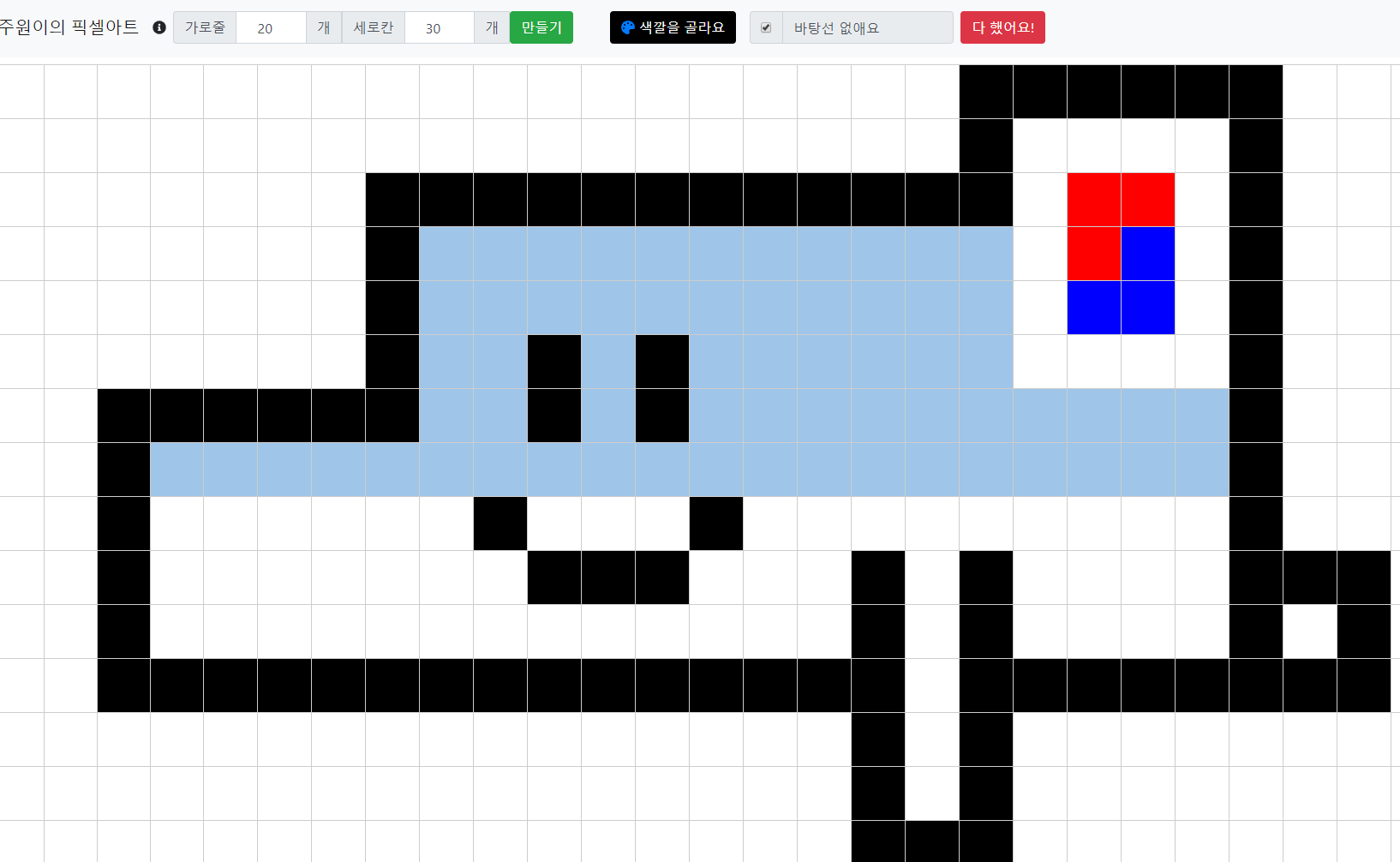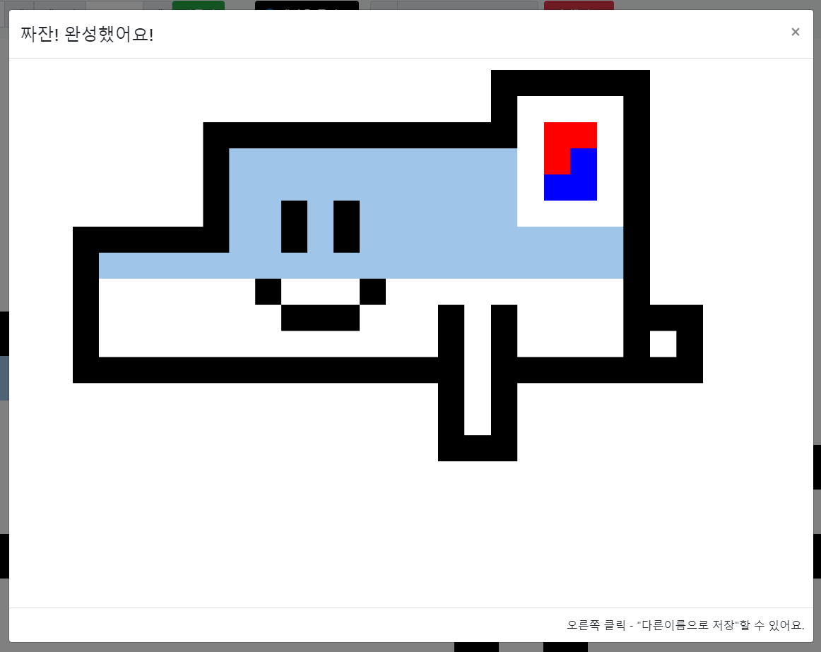 알면좋아요 픽셀아트 만들기 사이트 by 자연은 원래 느리다 2020. 5. 18. https://www.juwon.info/pa/index.html 주원이의 픽셀아트 www.juwon.info html과 css를 이용하여 만든 픽셀아트 그림판 입니다. 완성된 후에는 다른이름으로 저장할 수 있습니다. 크기를 정하고, 색깔을 클릭, 마우스로 클릭하거나 드래그합니다. 공유하기 게시글 관리 꾀꼬리하우스 저작자표시 비영리 동일조건 (새창열림) 관련글 교실 랜덤 자리뽑기 화면 캡쳐 단축키 픽셀아트로 그림 그리기 유튜브 퍼가기와 저작권 댓글